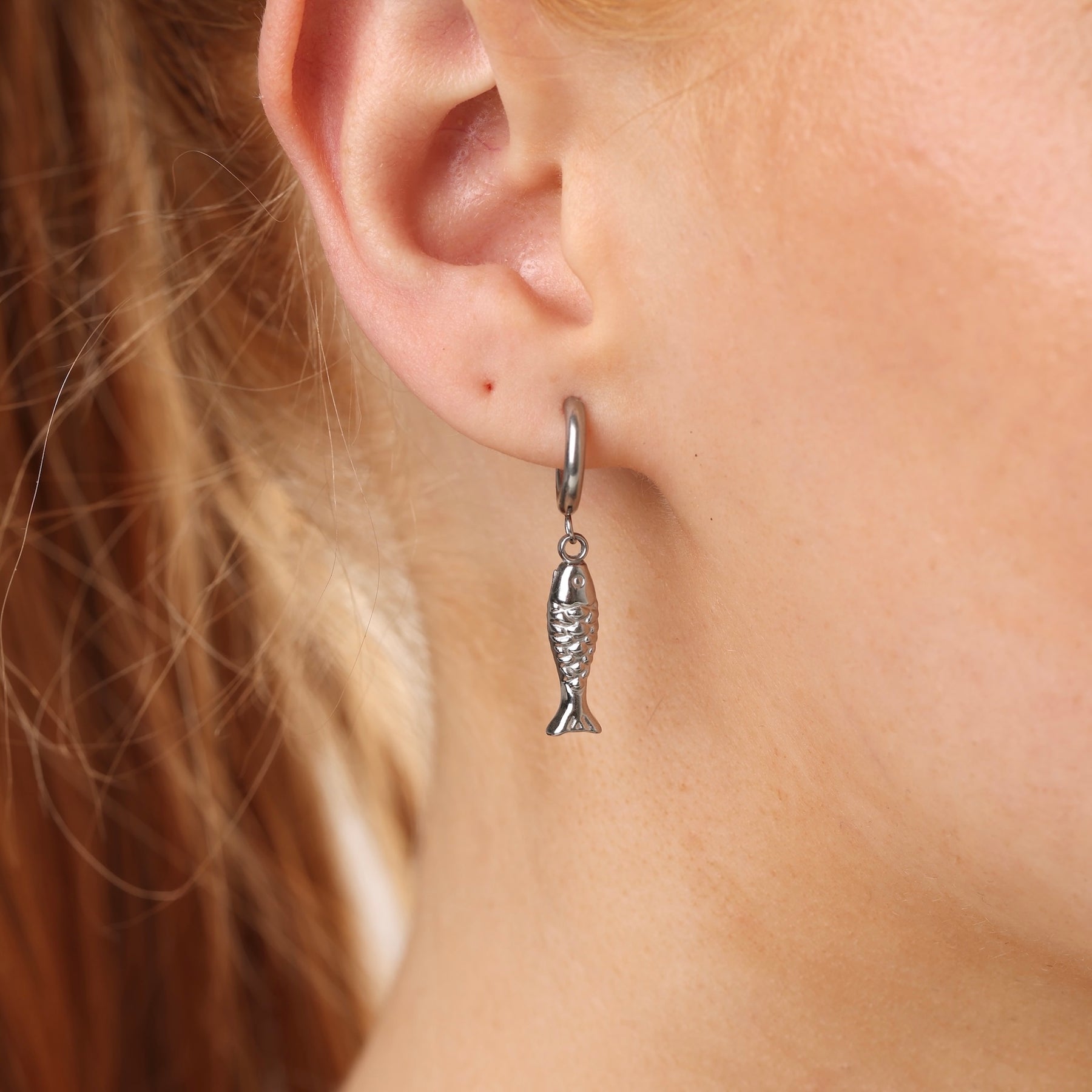 Fish hoops / charm hoops. Small hoops with a playful fish detail. Everyday but fun.